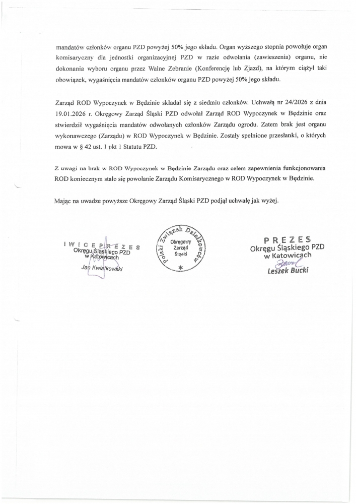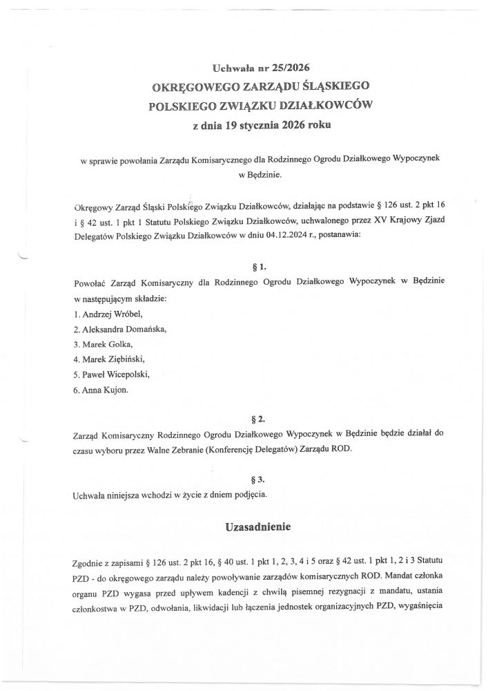 Okręgowy Zarząd Śląski Polskiego Związku Działkowców Uchwałą nr 25/2026 powołął Zarząd Komisaryczny ROD Wypoczynek w Będzinie.